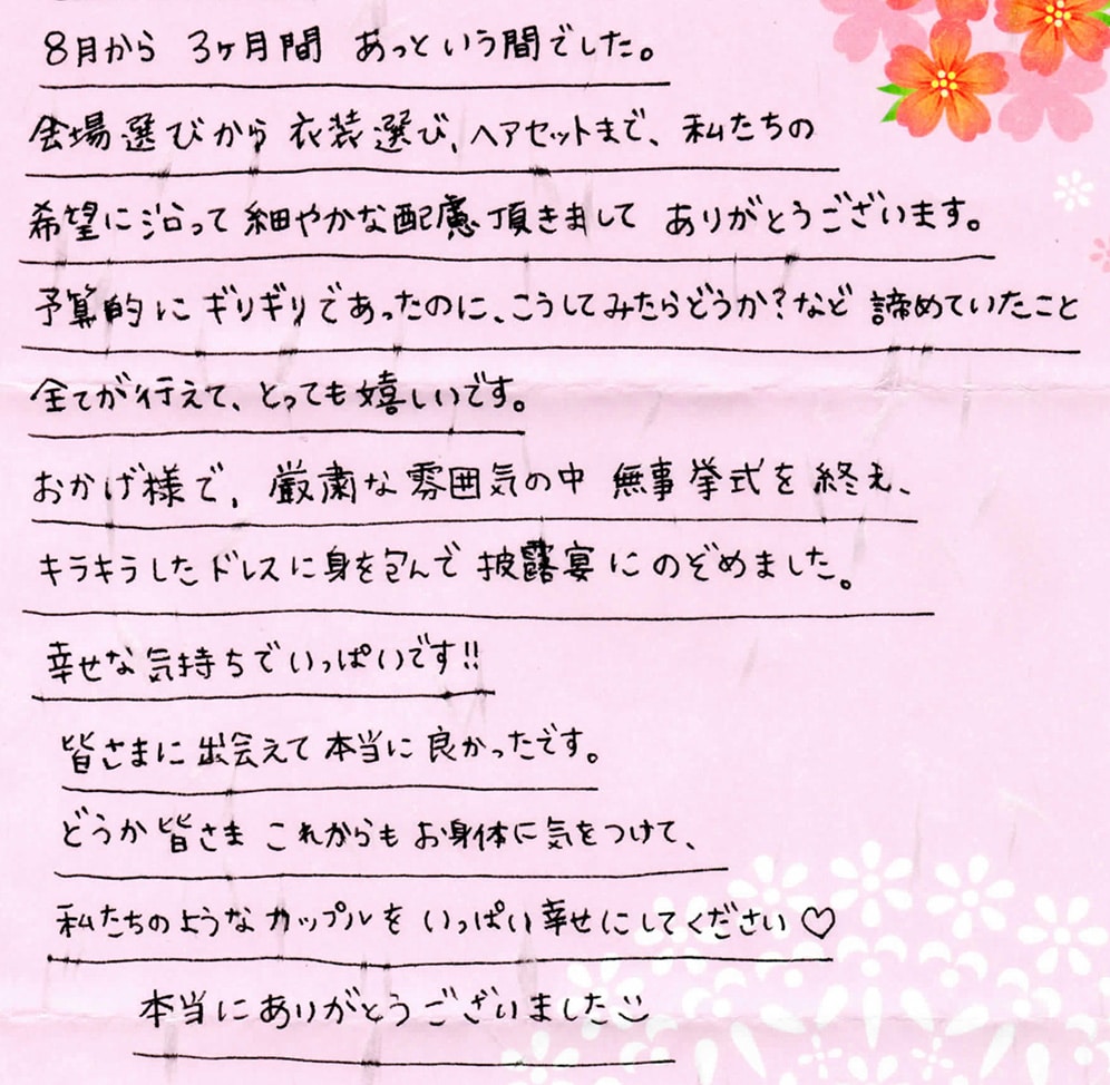 おかけ様で気に入ったドレスや和装でとても思い出に残る結婚式を挙げることができました。